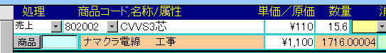 高精度演算データタイプの採用 従来、実数型のデータタイプでは丸め誤差、桁落ちといった問題が生じました。しかし高精度演算データタイプでは発生しません。 下図上では電線単価110円のものを 15.6mと入力しました。実数型では合計額は1716.00004円となってしまいますが下の高精度演算データタイプでは正しく計算します。