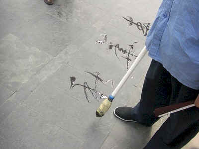 皇帝の后らが買い物ごっこをするために作らせた蘇州街。上海の西方にある蘇州を模した町並み 合唱するひとのほかに乾けば消える水で石畳などに字を書く人が何人もいる。地書というらしい。ほんとうに簡単そうにさらさらとうまい字を書く人がいる。 西安の南門の売店内に書を書いて売る書家がいた。なにか有名人と握手したり、表彰されている写真を掲載してりっぱな書家であるかのようにしていた。扁額用の同じ書を何枚も書いていたのでなれているはずなのに、書いた後、上からなぞったり、はねを強くしたりして修正していた。あまりにひどいので笑ってやろうか思ったが、そういうペテン書家よりこの地書書きの人の方がはるかにうまい。